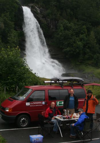 Am Abend nach der Kjerakwanderung ist es arschekalt. Um so mehr sind wir überrascht als am nächsten Morgen die Quecksilbersäule schon fast an die 20°C heranreicht. Doch mit dem "warmen" Wind kommt das trübe Wetter zurück. Schade, denn die Fahrt mit der Fähre durch den Lyse-Fjord könnte ein echter Pupillenschmaus sein. Immerhin sehen wir auf der Tour auch einige Robben, die sich regelmäßig im Fjord tummeln. Und auch Krali darf sich freuen; nach tagelangem Anglerpech, hängt ihm heute immerhin ein Seestern am Haken!!