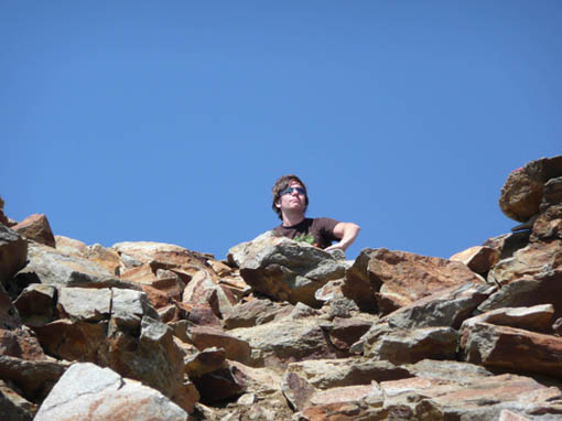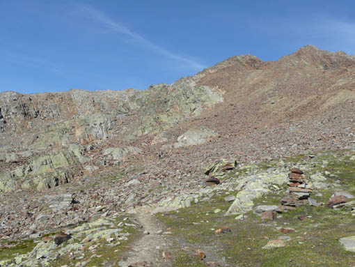 Der nächste Tag verspricht recht warm und sonnig zu werden. Ideal für unseren ersten Gipfelsturm. Steil geht es gleich bergauf und der Gipfel des Seikogels (3.355 m) wird erklommen. Aufgrund der mächtigen Gletscher rund herum und auch derer, die schon weit zurück gegangen oder leider gar nicht mehr vorhanden sind, ist die Landschaft recht karg und felsig. Sie gleicht einer Mondlandschaft, die aber durch die vielen Gletscherzungen fürs Auge aufgelockert wird. Das letzte Stück kurz vor dem Gipfel ist eine wahre Kletterei über große Felsbrocken. Aber dann stehen wir oben und haben eine grandiose Aussicht auf einige der Ferner (Gletscher), zum Hochjoch- und zum Niederjochferner (Ötzis Fundort) und zum Marzellferner. Hinunter geht es auf der anderen Seite wieder über einen schmalen Grat und weiterhin über Felsen. Dafür geht es seitlich vom Hochjochferner hinab und weiter unten begehen wir nur ein kurzes Stück des Gletschers. Vorsicht ist geboten!