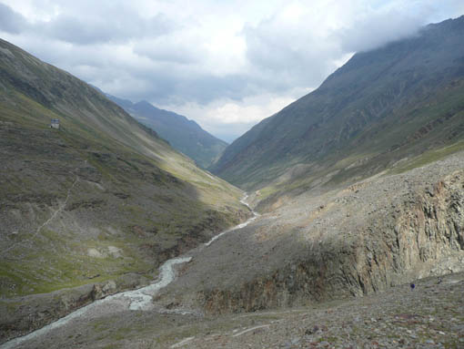 Inzwischen zieht der Himmel zu und es wird recht windig und nebelig. Wir sehen in der Ferne und in der Höhe unser Tagesziel, das Hochjochhospiz auf 2.412 m. Eine nette und kleine gemütliche Hütte wartet auf uns. Wir müssen erst noch entlang einer beeindruckenden Felsschlucht recht weit hinunter, um dann auf der anderen Seite wieder nach oben zu steigen. Wir kommen gerade noch rechtzeitig, bevor der erste Platzregen und dann auch nachts der Schneefall losgehen. Von wegen schönes Wetter ...