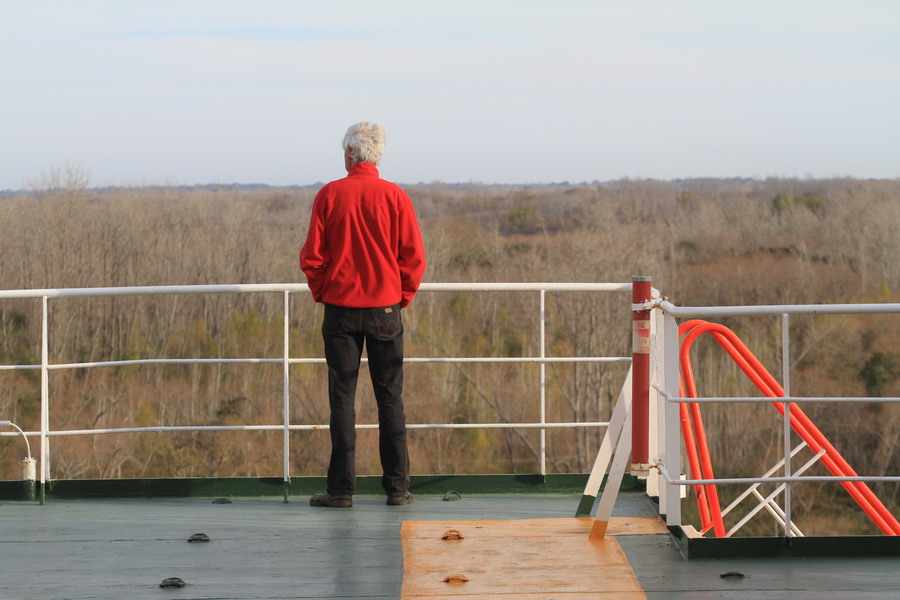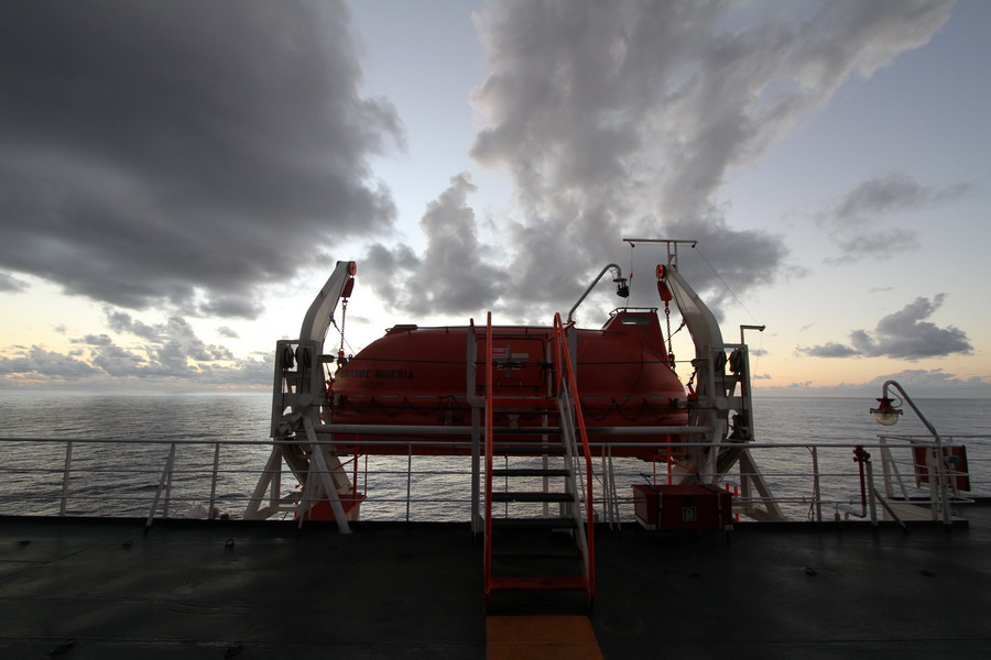 Die westafrikanischen Fischer haben mich schwer beeindruckt mit ihrem harten Leben auf See, aber auch unsere Besatzung muss ihren Mann stehen. Wir dürfen den Maschinenraum besuchen und erfahren was es für ein Knochenjob ist hier unten bei großer Hitze und Luftfeuchtigkeit die Maschinen in Schuss zu halten. Unsere Maschinisten sind interessanterweise vornehmlich Bulgaren, während die Offiziere fast ausschließlich aus Italien kommen. Die Crew wiederum besteht zu 100% aus Philippinos, so auch unser freundlicher Steward mit dem etwas ungewohnten Vornamen Rommel. Von ihm erfahre ich, daß manche Crewmitglieder bis zu 9 lange Monate am Stück auf See bleiben müssen. Auf der Grande Nigeria fährt er gerne mit,ist er so doch auf der piratensicheren Südamerika-Route unterwegs. Vor Somalia hatte er schon einmal Piratenkontakt erleben müssen, der zum Glück aber glimpflich abgelaufen ist. Auch ohne Feindkontakt ist die Mannschaft immer wieder gefordert und ich zolle ihnen vollsten Respekt, wenn ich sehe, wie die Jungs bei rauher See und starkem Wind ohne Sicherung die kaputte Reling schweißen (vor Hamburg hat das Schiff in bewegter See Container verloren, eventuell wurde bei dieser Aktion auch die vordere Reling zerstört?!).