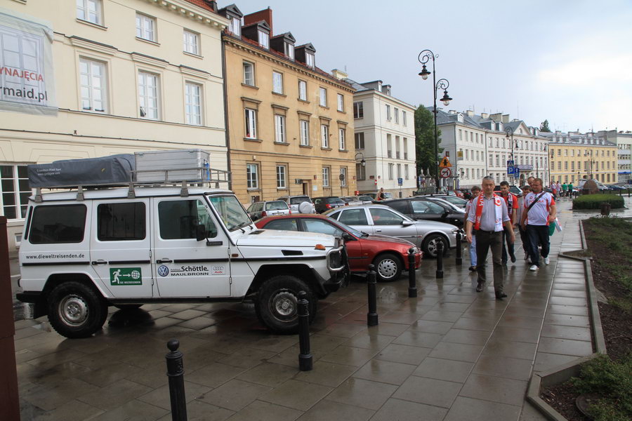 Sightseeing in der seit bald vierzig Jahren unter UNESCO-Schutz stehenden Altstadt ist natürlich Pflicht, dann geht es schon weiter nach Warschau. Heute ist EM-Start und wir wollen dort Rainer mit seinen EU-Kollegen aus Brüssel treffen. Nach der Superautobahn nach Krakau sind wir verwöhnt und damit umso enttäuschter als die Fahrt nach Warschau mühselig wird. Besonders hart wird es ab Höhe Lodz. Auf ca. 70km Länge (am Stück!!) wird gebaut. Die vermutlich längste Baustelle der Welt zieht uns den zahn. Auch die Fahrt ins warschauer Zentrum ist nicht ganz einfach, schwere Regenschauer und tausende von aufgeregten Fußballfans erschweren die Fahrt. Manche Straßen sind auch schon wegen der Fanmeile abgesperrt. Schlußendlich gibt es dann am Stadtschloss doch noch das glückliche Treffen mit Rainer. Er lotst uns zu unserer Unterkunft, wo wir das Auto sicher abstellen können, dann stürzen wir uns in das Warschauer EM-Leben. Am Kulturpalast im Herzen der Stadt ist die Fanmeile aufgebaut, die etwa 100 000 Menschen Platz bietet. Hier pulsiert die Action. Für die nächsten Stunden genießen wir hier und in der nahegelegenen Altstadt die Stimmung, die ersten Fuballspiele und natürlich das eine oder andere polnische Bier.