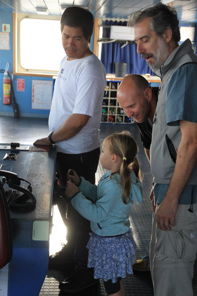 So zäh die ersten Schiffskilometer vergehen, so angenehm sind die Tage an Bord. Das Essen ist ausgezeichnet und die Besatzung ist sehr zuvorkommend, vor allem der Kapitän pflegt einen sehr guten Kontakt zu den Passagieren. Ellie ist der große Star an Bord und hat beim Steward, beim Schiffskoch und vor allem beim Kapitän einen gewaltigen Stein im Brett. Dank ihr bekommen wir eine Führung durch das ganze Schiff, sind auf der Brücke gern gesehene Gäste und Ellie darf auf dem Rio Parana sogar einmal das Steuer übernehmen.