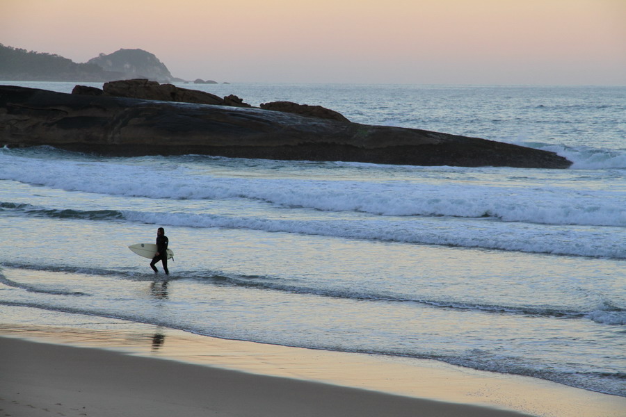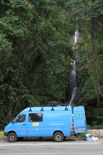 Die Strecke von Paraty nach Ubatuba fahren wir fast auswendig. Unangenehm wird es danach, die lästige Bremshügel-Route entlang der Küste wartet. Wenigstens ist das Wetter heute nach vielen schönen Tagen außerordentlich bescheiden. Da stört es nicht, daß wir ein paar Stunden im Auto verbringen und im zweiten/dritten Gang von Lombada zu Lombada zuckeln. Am Mittag erreichen wir Toque Toque Pequeno, ein wunderschöner Ort, der umgeben ist vom undurchdringlichen Regenwald des Parque Estadual do Serra do Mar. Ausnahmsweise gönnen wir uns für die Nacht eine Pousada und besuchen am Abend eine piekfeine Strandbar. Die Bar strapaziert zwar etwas unser Reisebudget, aber der Laden hat Stil. Besonders lässig finde ich das Vogelhäuschen, dass in der Dämmerung ständig von hungrigen Fledermäusen angeflogen wird, die sich an den ausgelegten Früchten bedienen.