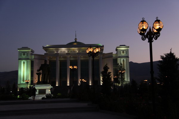 Wir wollen in Ashgabat nicht auf unsere Fahrzeuge verzichten also müssen wir sie erstmal hauptstadtfein machen. Verkehrsteilnehmer mit staubigen Fahrzeugen müssen schon mal mit einem Strafzettel rechnen. Interessante Regelung in einer Stadt, die eigentlich mehr oder wenig in der Wüste liegt. Aber Ashgabat sieht auch wirklich geleckt aus, überall sind die Strassenfeger im Einsatz und die unzähligen weissen Marmorgebäude verleihen der Stadt einen gewissen Glanz. Noch glänzender sind die zahlreichen Turkmenbashi-Statuen. Der neurotische vormalige Staatsführer N?yazow hatte ein Faible für Gold. Nicht immer sind diese Statuen aber einfach zu fotografieren. Turkmenistan wird im Reiseführer als das Nordkorea Zentralasiens bezeichnet. Seit dem Tod Nyazows hat sich wohl manches geändert/verbessert, aber auch wir werden von Polizei und Militär immer wieder mißtrauisch beäugt und uns das Ablichten bestimmter Gebäude verboten. In einem der wenigen Internetcafes wird uns der Pass abgenommen und unsere Namen in eine Liste eingetragen. Auch die Hotels und wichtige Restaurants der Stadt sollen laut Reiseführer verwanzt sein. Ob das wirklich stimmt wissen wir nicht, zur Sicherheit verwenden wir für delikate politische Begriffe Codewörter wie FC Bayern oder Kirschkuchen. Bei der Auswertung von potentiellen Hotelkameras wären die Beamten sicherlich auch nur belustigt beim Anblick der geizigen Touristen, die aus Geldknappheit auf dem Hotelbalkon kochen.