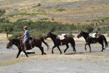 Die Tour zum Grey Gletscher ist klasse und auch unsere Abende am Lago Pehoe sind sehr schön. Bei schönem Abendlicht haben wir immer wieder wunderbare Ausblicke auf die Berge. Zudem ergeben sich auf dem Zeltplatz interessante Begegnungen mit Reisenden aus aller Welt. Am letzten Abend treffen wir eine russische Familie. Die langen Gespräche führen uns natürlich auch zum Thema Politik, was bei der aktuellen Lage in der Ukraine sehr spannend ist. Vorbei am Salto Grande, Gürteltieren und ungezählten Guanakos fahren wir dann am Folgetag zum Wahrzeichen des Parks, den sogenannten Torres/Türmen. Viele schöne Aussichtspunkte bremsen uns aus, sodass wir zu spät in unsere Tageswanderung einsteigen. Bevor wir den Mirador am Fuß der Torres erreichen, müssen wir umdrehen. Schönerweise gibt es die Möglichkeit mit dem Pferd aus den Bergen zurückzureiten. Da uns Ellie seit Tagen schon wieder mit einer Reittour in den Ohren liegt, nutzen wir diese Option. Mir ist die Reiterei auf den engen Wegen direkt am Abgrund zu heikel, ich gehe zu Fuß, aber Isabel und vor allem Ellie sind in ihrem Element.