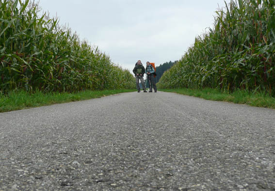 Häufig werden wir auf unserem Weg angesprochen, vornehmlich in den unzähligen an unserer Strecke liegenden Dörfern. Bewohner sprechen uns auf der Straße an, fahren gar mit dem Fahrrad hinter uns her, um zu erfahren, wohin wir denn mit solch großen Rucksäcken wandern. Diese kleinen Unterhaltungen machen unsere Wanderung auf jeden Fall komplett und wir sprechen mit vielen netten Menschen, die uns auch immer wieder Tipps für einen kleinen Abstecher oder für eine Streckenänderung geben, damit wir das eine oder andere Highlight der Gegend oder einen tollen Aussichtspunkt nicht verpassen. Oftmals tatsächlich Gold wert, denn des öfteren verläuft der HW 5 leider auf Asphalt, was mit unseren schweren Rucksäcken nicht gerade die entspannteste Art zu wandern ist.